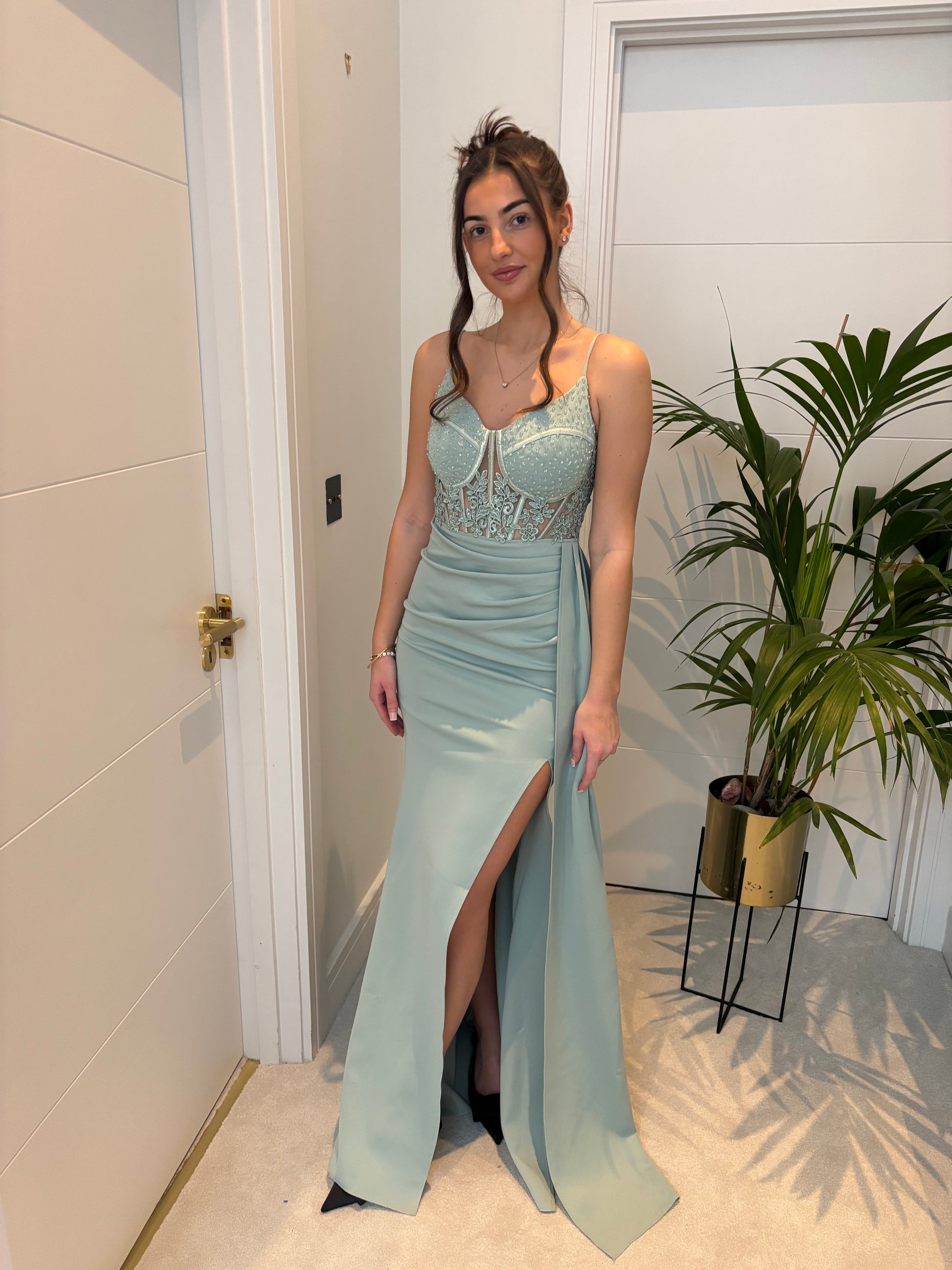 HARPER GOWN SAGE GREEN WITH LACE AND DIAMONTE BODICE