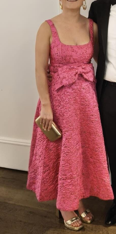 Made from beautiful pink jacquard fabric, in a soft square neck and skater style skirt. Pockets and detachable bow .