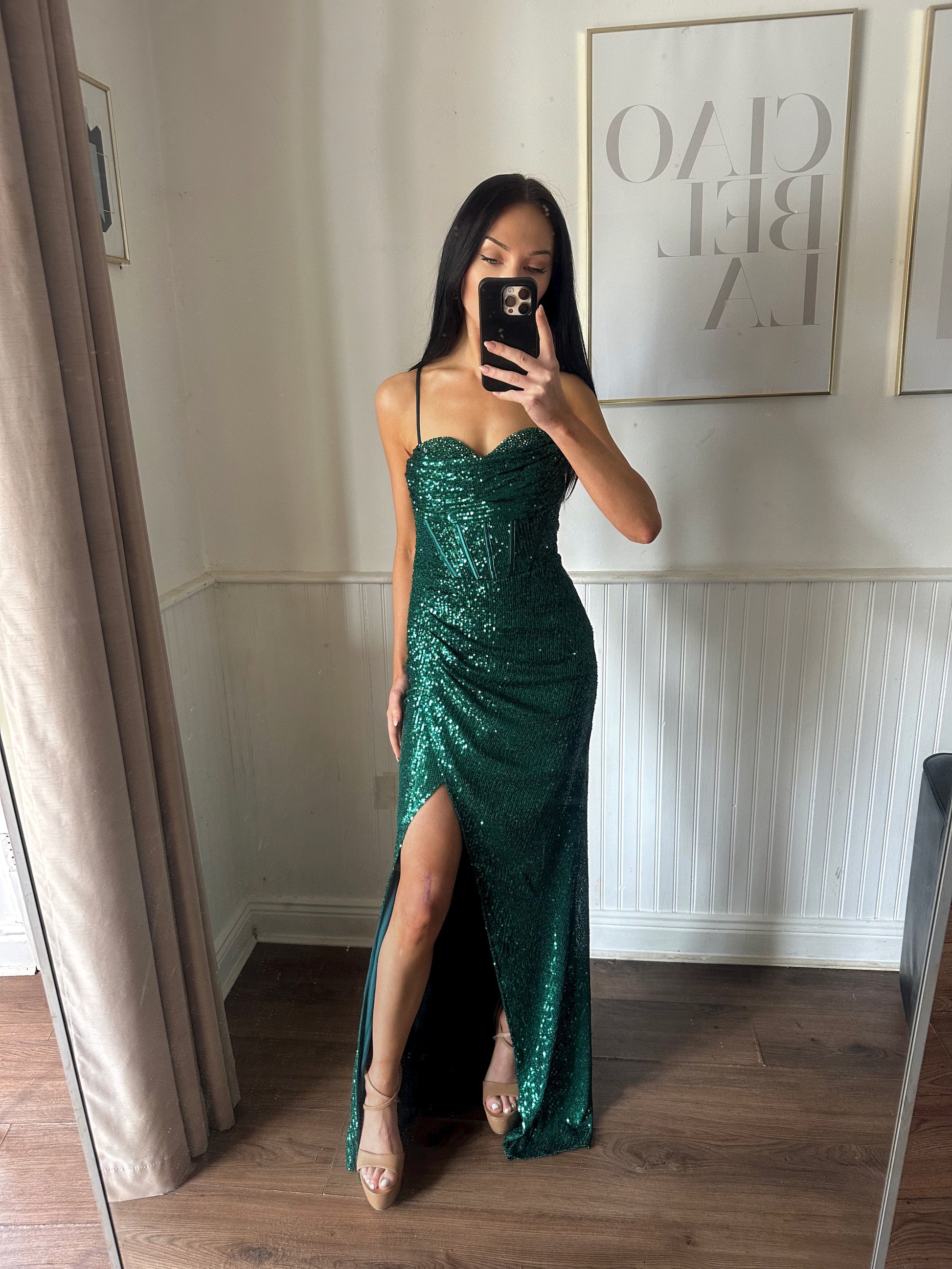 Featuring a dimonte encrusted bust, sequin corset and gorg fitted skirt with slit