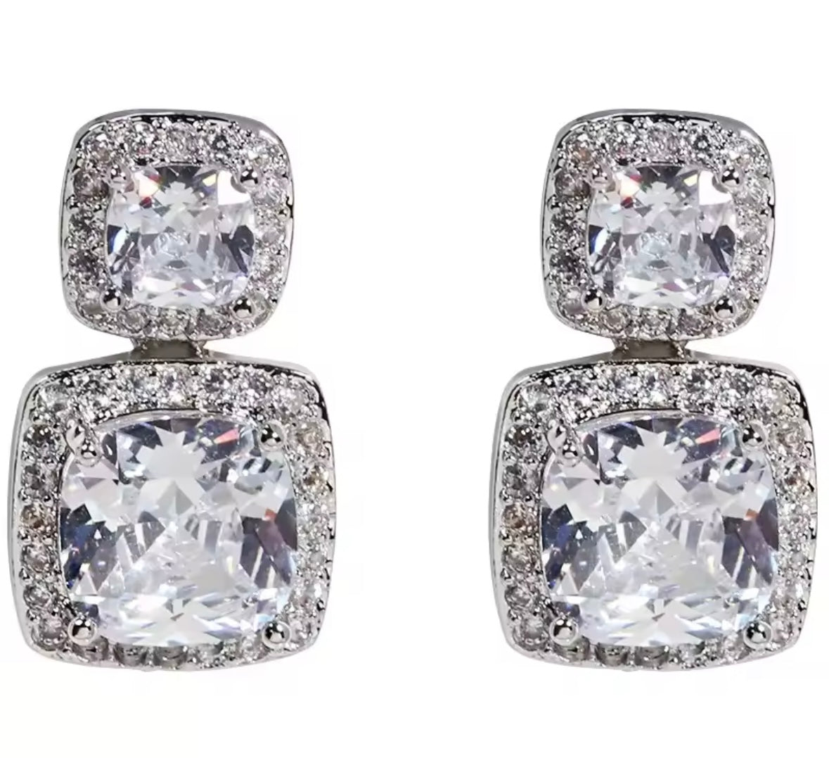 Square drop diamonte earrings encrusted in silver diamanté with a silver underlay.