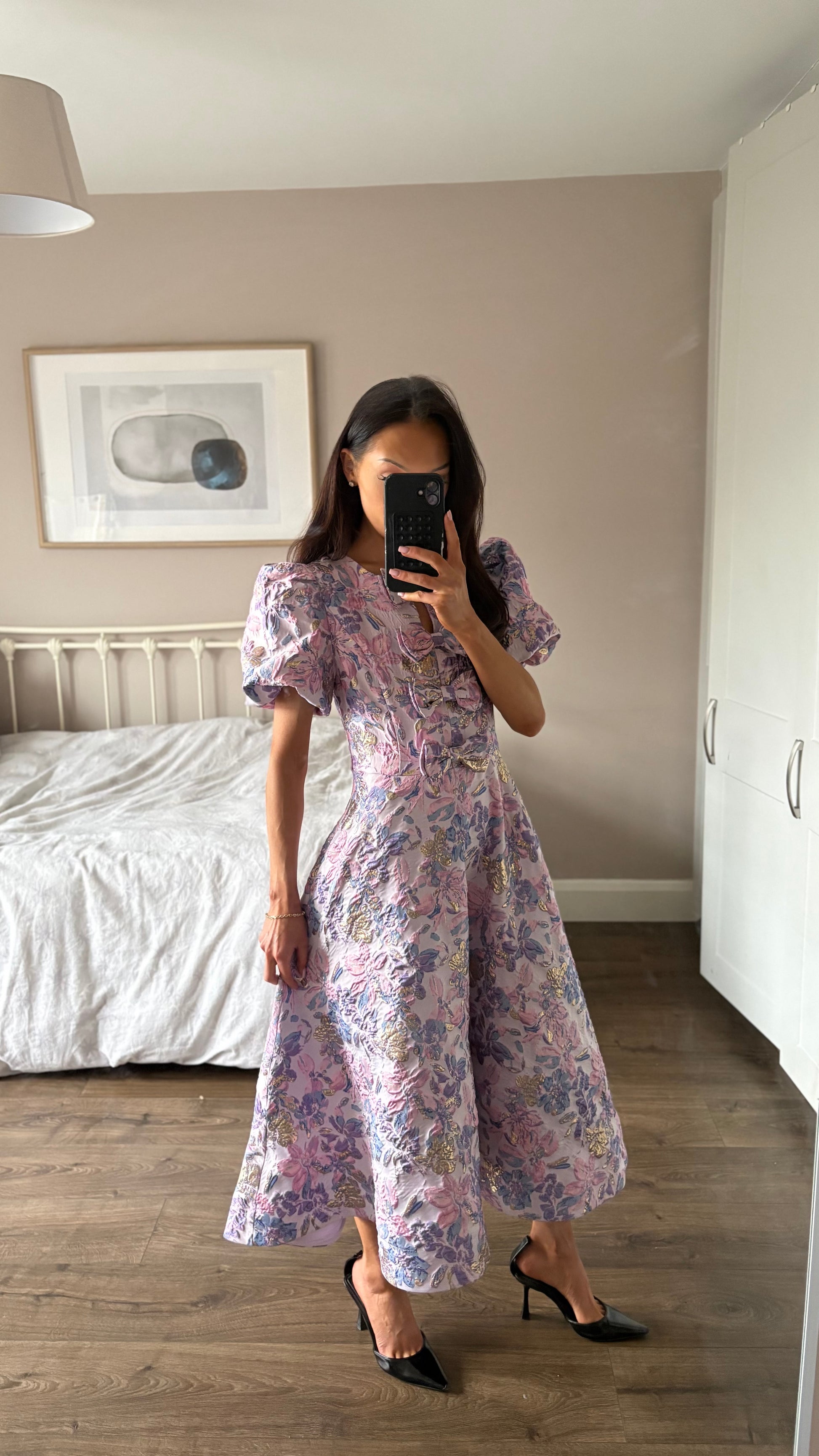 Made from beautiful red jacquard fabric, with x4 bows on the chest and puff sleeves in a sweeping layer style skirt!